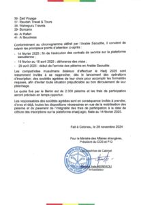 Home Actualité Divers services d’assistance pour le Hadj 2025 : le gouvernement dévoile la... ActualitéPolitique Divers services d’assistance pour le Hadj 2025 : le gouvernement dévoile la liste des 41 sociétés agréées By Rollis HOUESSOU - 28 novembre 2024 672 0 FacebookTwitterPinterestWhatsApp Le Ministre des Affaires étrangères, Président du Comité d’Orientation et Supervision (COS) du Hadj, a dévoilé la liste des sociétés agréées pour la fourniture des services d’assistance aux pèlerins au titre du pèlerinage 2025. Liste complète 👇 👇