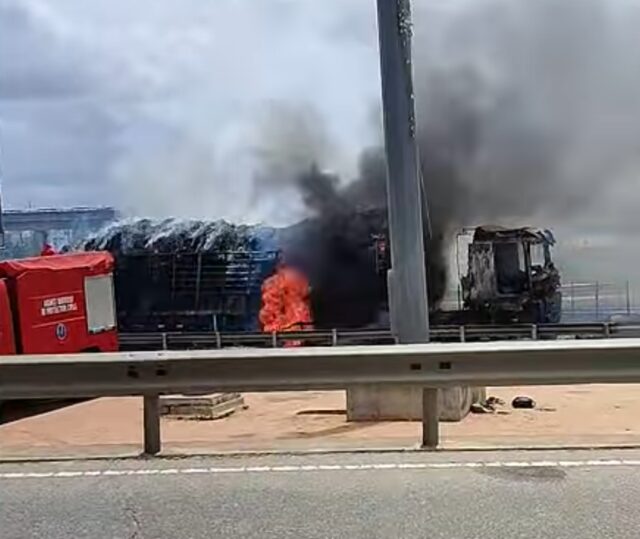 Un spectaculaire incendie paralyse la circulation sur l’axe Abomey-Calavi – Cotonou depuis ce midi. Un gros porteur, transportant une cargaison hautement inflammable, a pris feu après avoir percuté la structure de l’échangeur de Godomey. Les sapeurs-pompiers sont toujours à pied d’œuvre pour maîtriser les flammes.